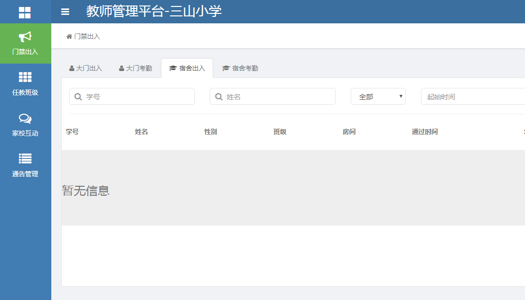 學(xué)生在非宿舍時間進(jìn)出宿舍需打卡,教師可按(學(xué)號、姓名、班級 、時間段)查詢學(xué)生進(jìn)出宿舍信息(班級、學(xué)號、姓名、進(jìn)出時間抓拍圖片等).