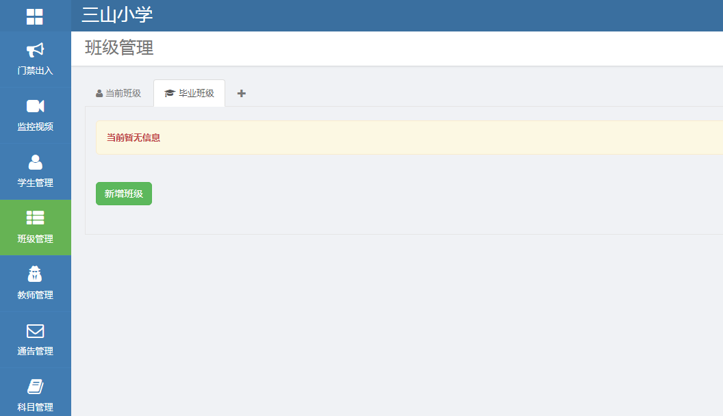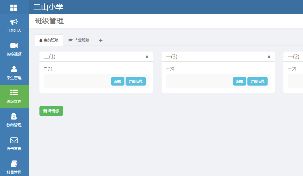 顯示所有的畢業(yè)班級信息, 管理員可編輯和查看班級詳細(xì)信息,可添加新的班級信息.
