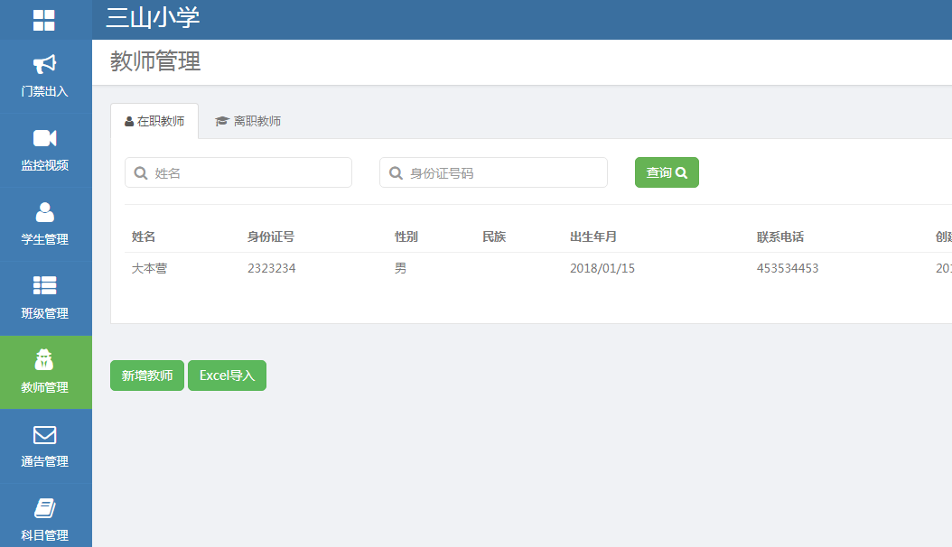 顯示當(dāng)前在職的教師信息, 管理員可按姓名和身份號查詢教師信息,可添加或Excel導(dǎo)入教師信息.