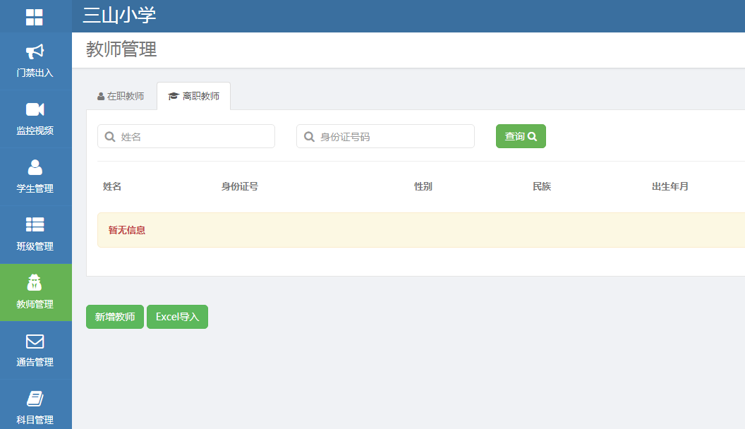 顯示離職教師的教師信息, 管理員可按姓名和身份號查詢教師信息,可添加或Excel導(dǎo)入離職教師信息.