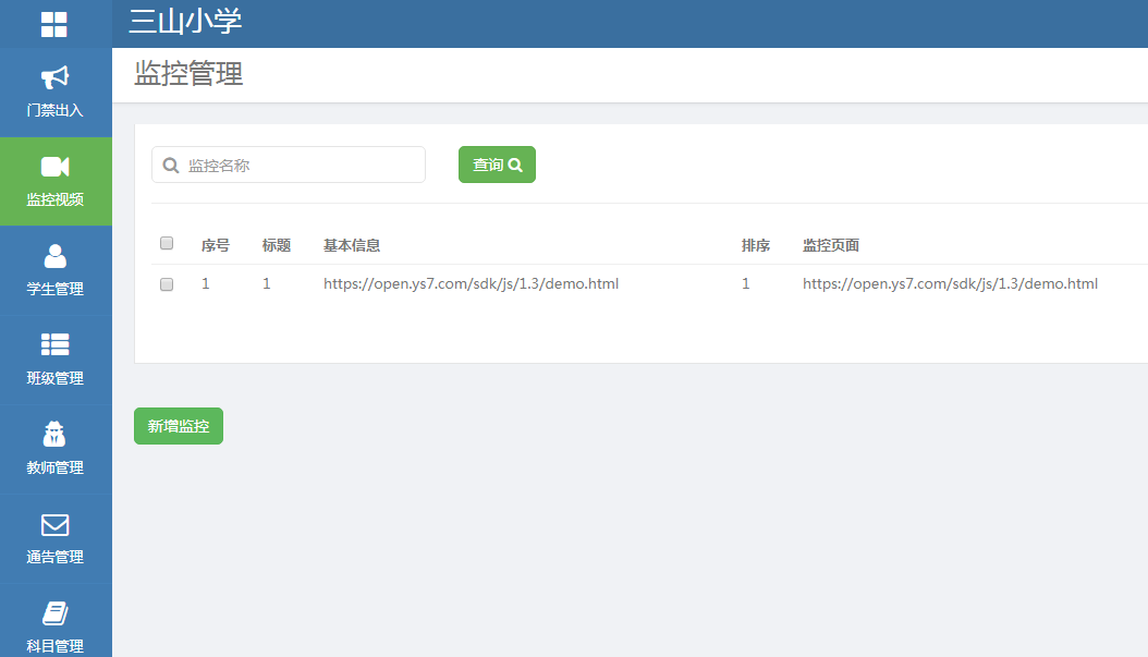 學(xué)校管理端可檢查學(xué)生的出入校門考勤情況,可查看學(xué)校的監(jiān)控設(shè)備,和查看和管理學(xué)生的信息, 可管理所有的班級信息,可管理教師信息、通知公告和科目管理.