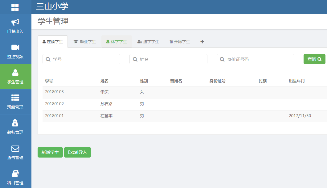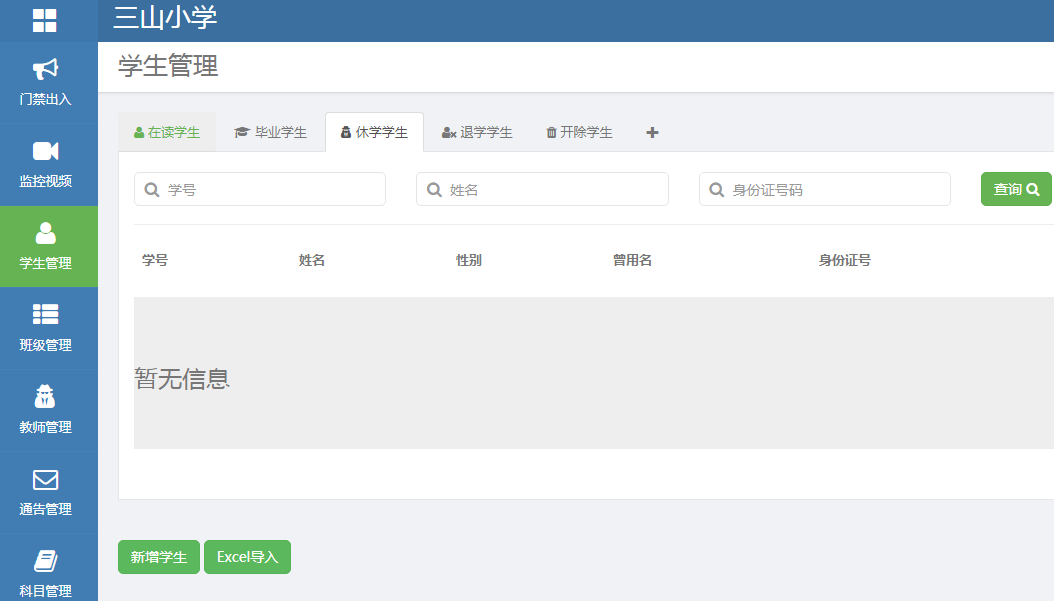 管理員可按(學(xué)號、姓名、身份證號碼)查詢休學(xué)學(xué)生信息,可 添加和Excel導(dǎo)入學(xué)生信息.
