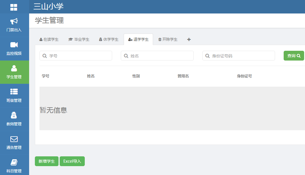 管理員可按(學(xué)號、姓名、身份證號碼)查詢退學(xué)學(xué)生信息,可 添加和Excel導(dǎo)入學(xué)生信息.