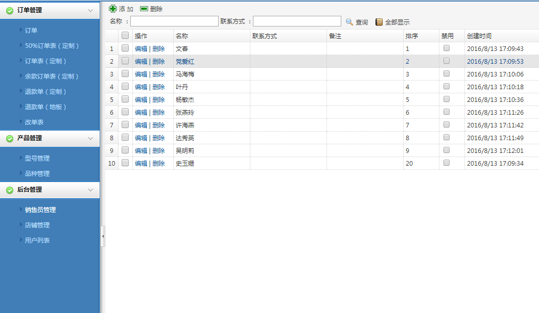顯示所有的銷售員信息,管理員可添加、編輯和刪除銷售員信息,管理員可按(名稱和聯(lián)系方式)查詢銷售員信息。
