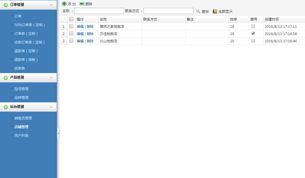 顯示所有的店鋪信息,管理員可添加、編輯和刪除店鋪管理,管理員可按(名稱和聯(lián)系方式)查詢店鋪信息。