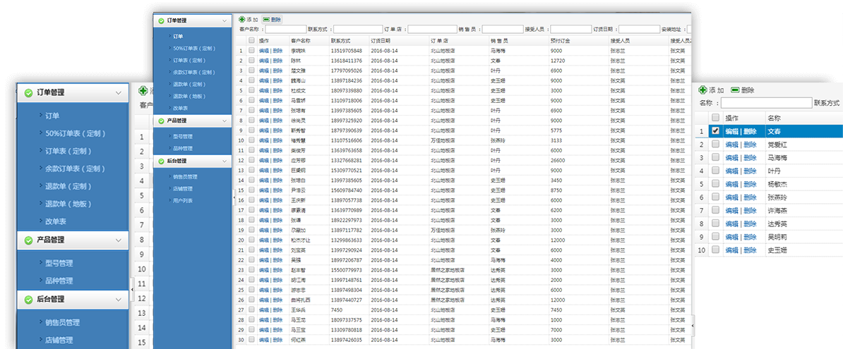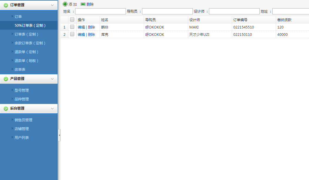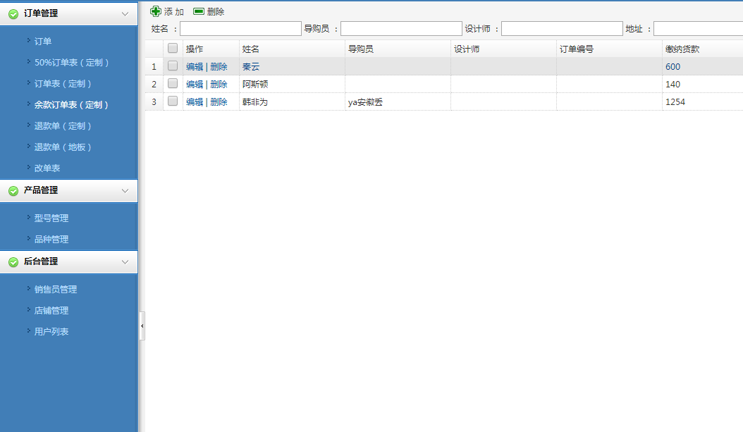 顯示所有的定制余額訂單表,管理員可添加、編輯和刪除訂單表信息,管理員可按(姓名、導(dǎo)購員、設(shè)計(jì)師、接收人等)可查詢訂單表信息。