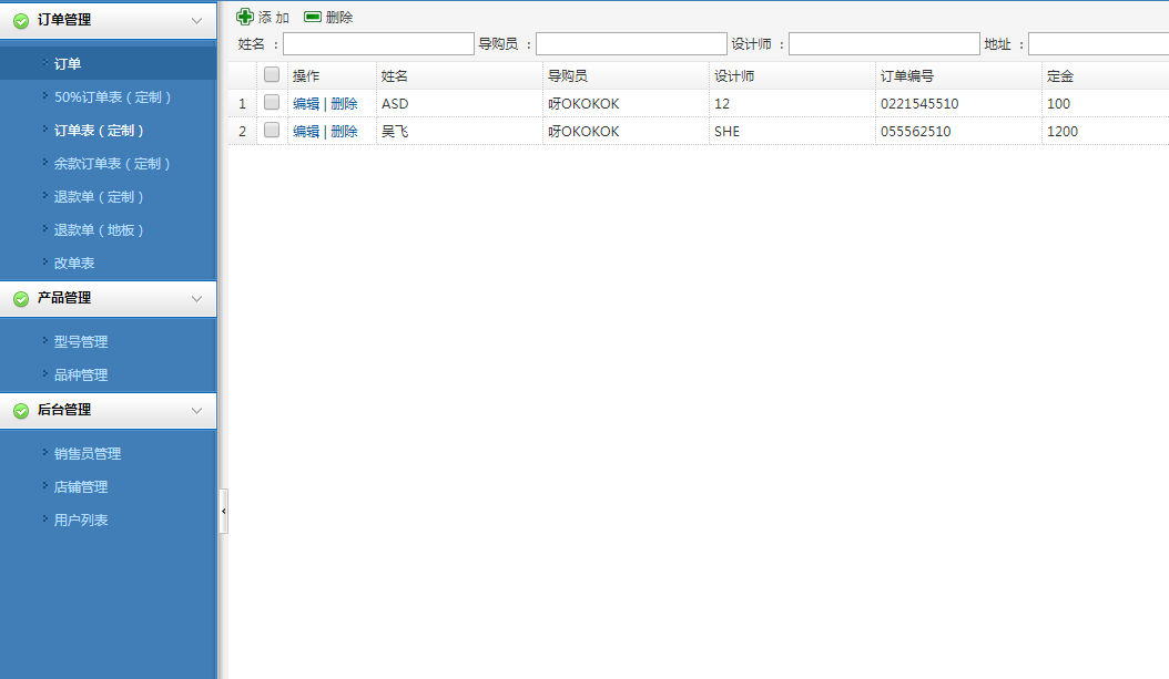 顯示所有的定制訂單表信息,管理員可添加、編輯和刪除訂單表信息,管理員可按(姓名、導(dǎo)購員、設(shè)計(jì)師、接收人等)可查詢訂單表信息。