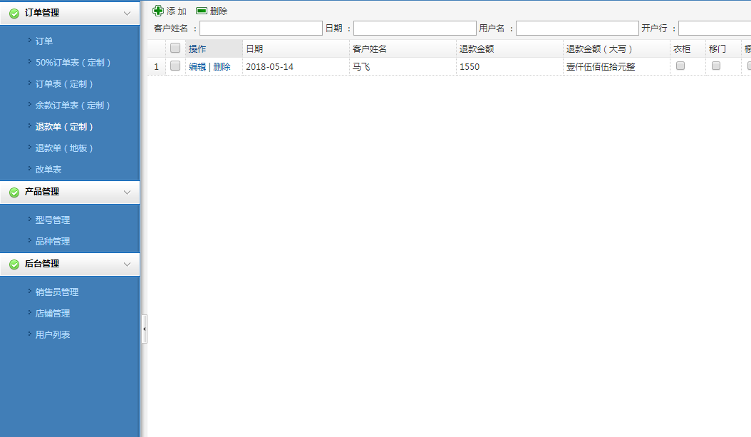 顯示所有的定制退款表信息,管理員可添加、編輯和刪除退單表信息,管理員可按(姓名、日期、用戶名、開戶行)可查詢退貨單信息。