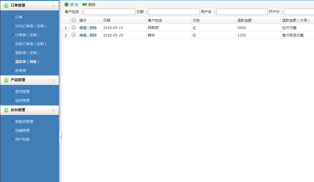 顯示所有的退款地板訂單信息,管理員可添加、編輯和刪除訂單,管理員可按(姓名、日期、用戶名、開戶行)查詢退貨單信息。