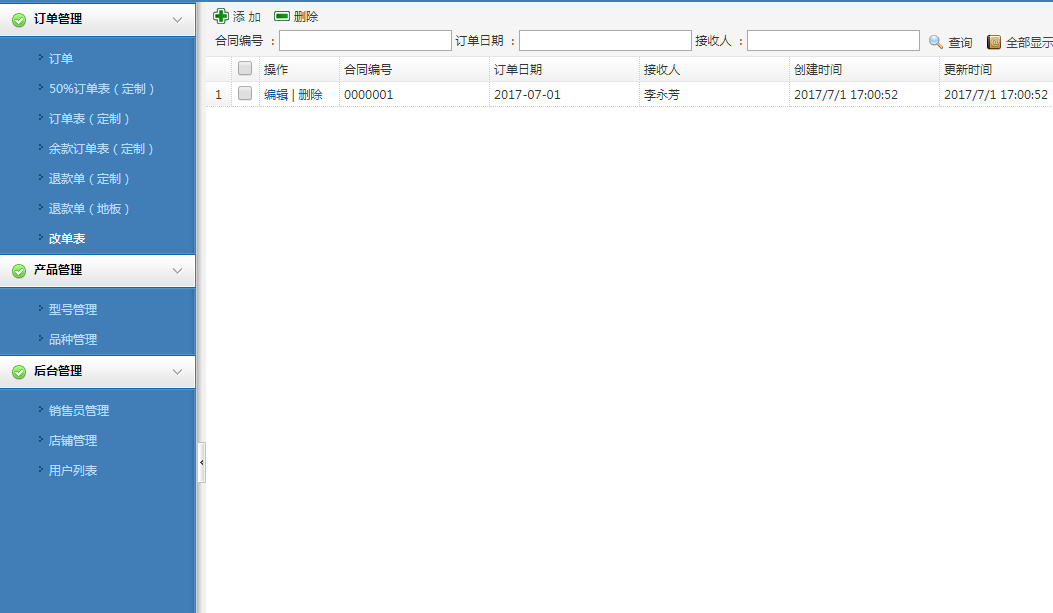 顯示所有的改單表信息,管理員可添加、編輯和刪除改單表,管理員可按(合同編號(hào)、訂單日期、接收人)查詢改單表信息。