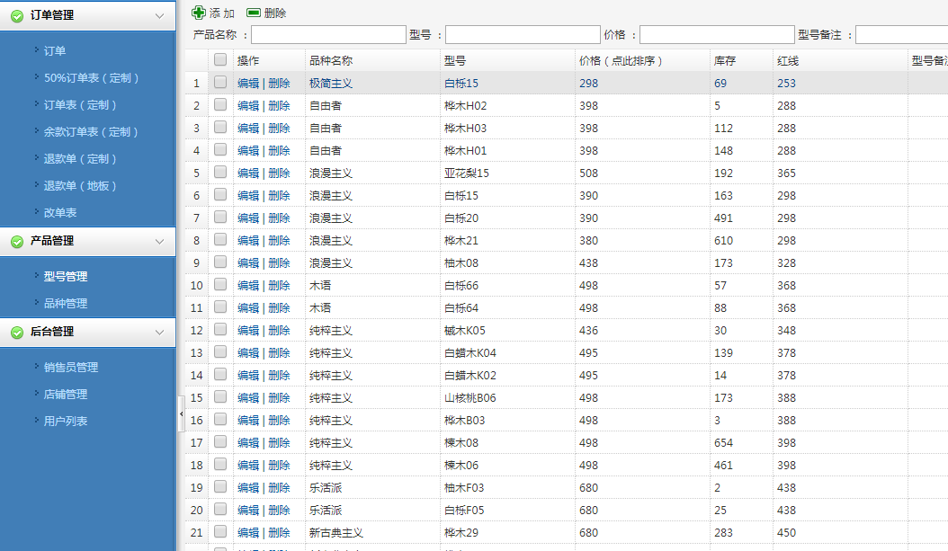 顯示所有的型號(hào)信息,管理員可添加、編輯和刪除型號(hào)信息,管理員可按(產(chǎn)品名稱、型號(hào)、價(jià)格、型號(hào)備注)查詢訂單信息。