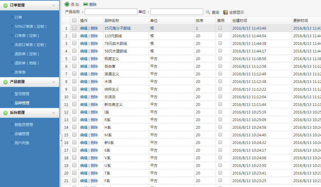 顯示所有的品種信息,管理員可添加、編輯和刪除訂單,管理員可按(產(chǎn)品名稱、單位)查詢品種信息。
