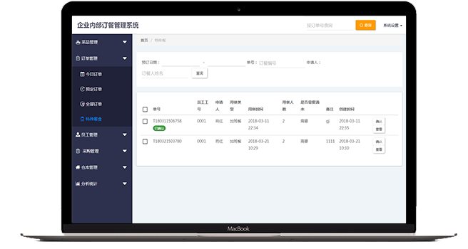 特殊餐食包括:特殊餐食包括(加班餐),管理員可查詢、查看和確認(rèn)訂單信息,確認(rèn)過(guò)的訂單可駁回。