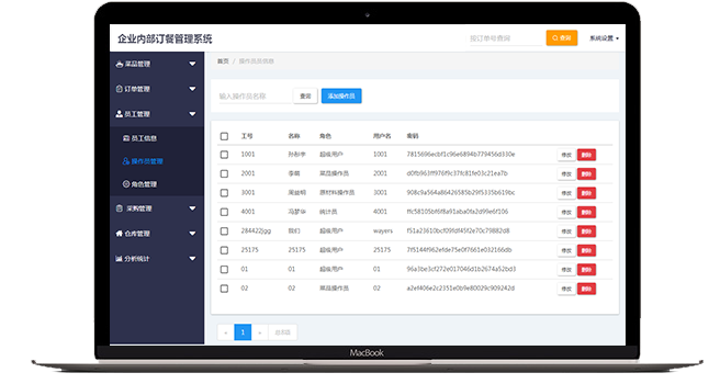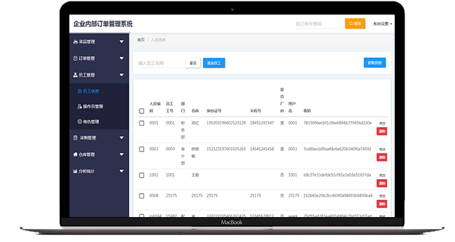 員工信息包括:顯示企業(yè)里所有的員工信息(工號(hào)、部門(mén)、姓名、賬號(hào)、密碼等),管理員可添加、編輯、查詢和刪除員工。