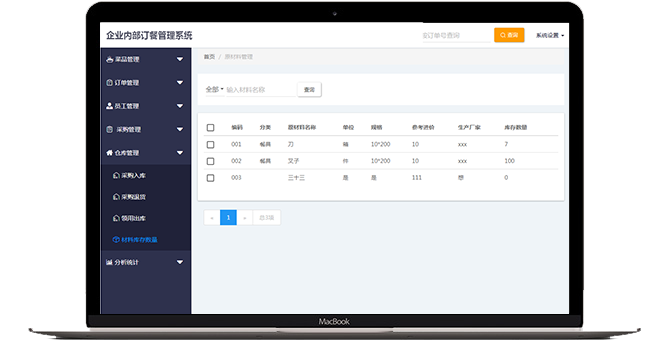 原材料管理包括:顯示所有的原材料信息,管理員可添加、編輯、查詢和刪除原材料信息