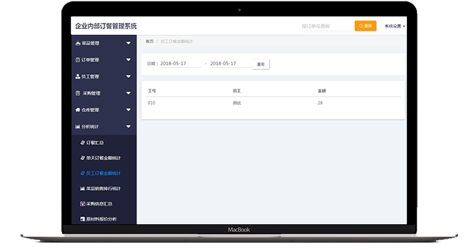 員工訂餐金額統(tǒng)計(jì)包括:顯示所有的員工訂餐的信息,管理員可按日期查詢員工訂餐金額。