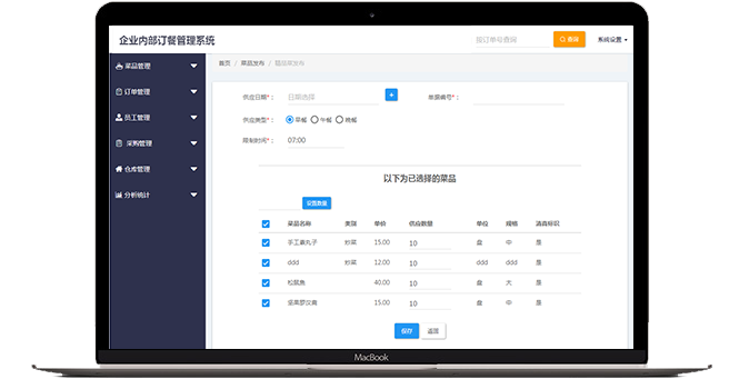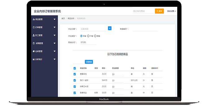 精品菜發(fā)布包括管理可發(fā)布指定日期的早餐、中餐、晚餐(自動(dòng)生成單據(jù)編號(hào))。