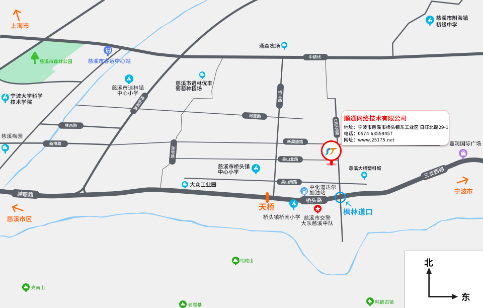 5、上海來公司:上海至慈溪客運(yùn)中心站坐201/263路(白天)或者801(晚上)公交車到橋頭鎮(zhèn)楓林站下車[公交正常30-40分鐘],然后往日旺北路往北方向直走10分鐘(約750米)到順通網(wǎng)絡(luò)。