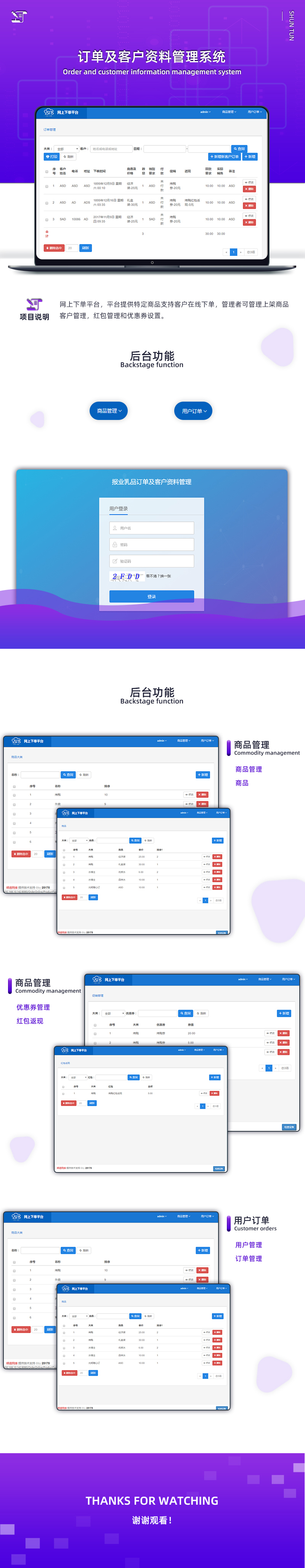 訂單管理、用戶管理、商品分類管理、商品管理、優惠券管理、紅包返現管理